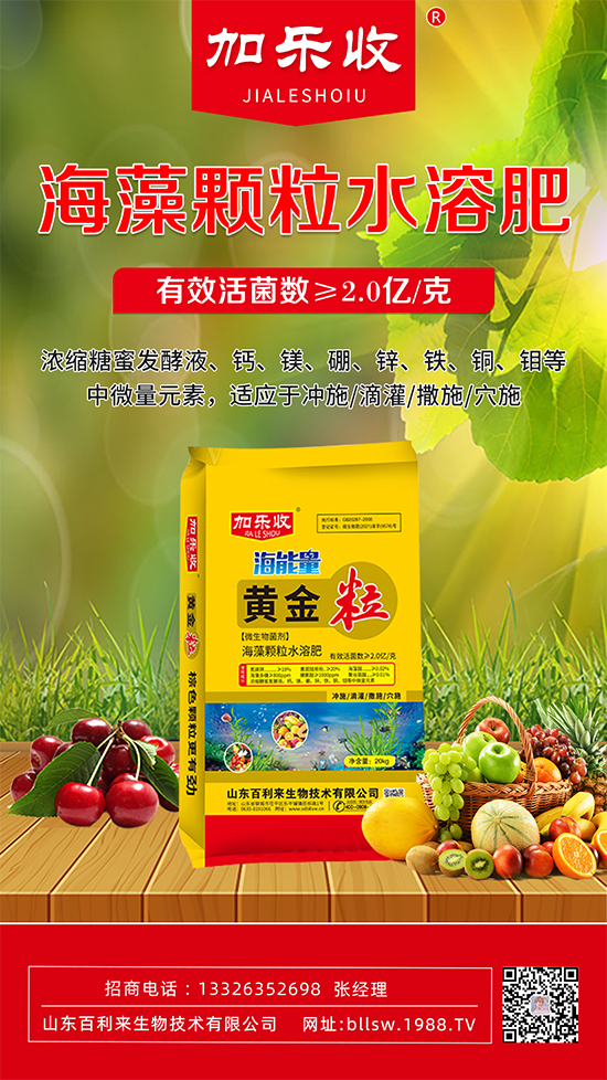 山東百利來生物技術有限公司【海藻顆粒水溶肥-黃金!渴歉鶕(jù)土壤多年連作重茬種植、施肥嚴重過量導致的有益菌過度消耗、土壤板結、鹽漬化,嚴重影響作物根系對土壤中養(yǎng)分的吸收利用。本品在研制中把氮、磷、鉀、中微量元素進行合理配比,特別添加功能性有益菌群、海藻酸、海藻多糖、黃腐酸鉀、脯氨酸、聚谷氨酸等有機載體,應用生物雙螯合技術螯合而成。