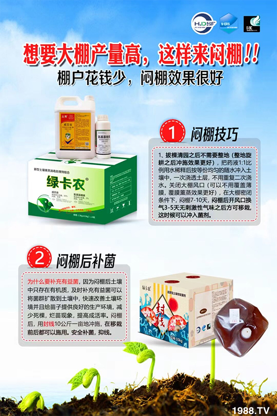 大棚的土壤已經(jīng)壞了!用再多的肥料也高產(chǎn)不了!是時(shí)候改土殺線蟲(chóng),老棚變新棚了!燜棚是一種簡(jiǎn)單有效的農(nóng)業(yè)防止措施,能夠從土壤本質(zhì)入手,從根本上解決問(wèn)題,從而達(dá)到理想的防治效果。