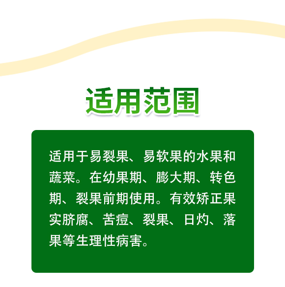 效果顯著:可有效補(bǔ)充作物所需的微量元素,提高自身免疫,促進(jìn)果實(shí)膨大和著色,有效矯正果實(shí)臍腐、苦痘、裂果、日灼、落果等生理性病害。