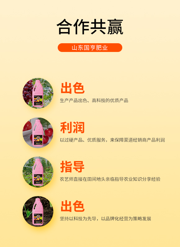 公司緊隨市場(chǎng)變化,關(guān)注肥料高新科技的發(fā)展趨勢(shì),在國(guó)內(nèi)市場(chǎng)銷售的同時(shí),也積極出口國(guó)外貿(mào)易。公司現(xiàn)有“國(guó)亨”“ 田園壯”兩大品牌,依托強(qiáng)勢(shì)的服務(wù)和強(qiáng)大的品牌理念,公司在不斷發(fā)展壯大。一直以來(lái),公司總是處于時(shí)代的前列,超前發(fā)展的思想,始終占領(lǐng)市場(chǎng)競(jìng)爭(zhēng)的至高點(diǎn)。