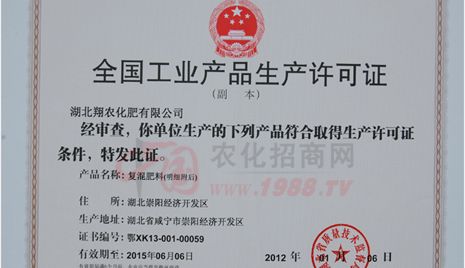 公司始建于1999年6月,為民營股份制企業(yè)。主要生產(chǎn)“翔農(nóng)”、“新生”、“崇豐”牌系列復合肥料。2006年3月,已取得國家頒發(fā)的高濃度《全國工業(yè)產(chǎn)品生產(chǎn)許可證》;同年10月,企業(yè)已通過GB/T19001-2008/ISO9001:2008質量管理體系認證;2007年9月,被湖北省農(nóng)業(yè)廳認定為《湖北省測土配方肥料定點加工企業(yè)》;2009年5月,被咸寧市政府授予“咸寧市農(nóng)業(yè)產(chǎn)業(yè)化市級重點龍頭企業(yè)”的光榮稱號;同年11月,被咸寧市質量興市領導小組辦公室授予“質量監(jiān)督檢驗三年合格單位”。2011年12月,公司產(chǎn)品被湖北省實施質量興省戰(zhàn)略工作領導小組授予“湖北產(chǎn)品”。2012年9月,“翔農(nóng)”商標榮獲湖北省著名商標。