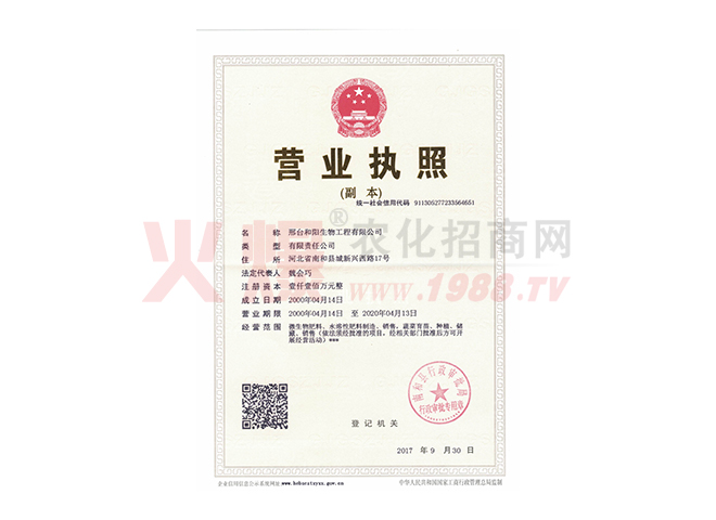 和陽生物企業(yè)堅持“保持地力常新、創(chuàng)造生態(tài)文明”的理念,將“服務(wù)三農(nóng)和增加客戶效益”作為企業(yè)宗旨。利用生物技術(shù)提高作物物理肥力、化學肥力、生物肥力與有害因子,取得了良好效果。公司還積極參與國家各級有機質(zhì)提升工程、降低農(nóng)牧業(yè)污染治理和有機農(nóng)產(chǎn)品基地建設(shè)項目、果菜茶有機肥代替化肥項目等。公司年生產(chǎn)生物系列產(chǎn)品十幾萬噸,產(chǎn)品銷往河北、河南、山東、山西、陜西、北京、天津、上海、江蘇、浙江、安徽、甘肅、遼寧、內(nèi)蒙、廣東、海南、新疆等多個省市自治區(qū),企業(yè)品牌和產(chǎn)品贏得了社會廣泛的信賴,被河北省科技廳定為“高新科技企業(yè)”、“高科技產(chǎn)品”“河北省博士后創(chuàng)新實踐基地”,并曾多次獲得河北省消費者信得過產(chǎn)品稱號。