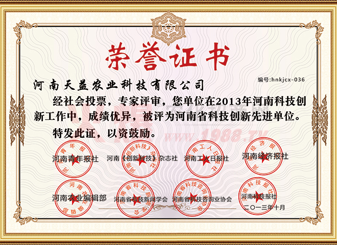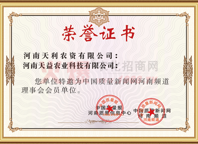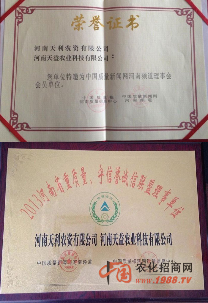 河南天利農(nóng)資有限公司為更好拓展市場和適應(yīng)市場發(fā)展趨勢,2013年9月注冊分公司“河南天益農(nóng)業(yè)科技有限公司”注冊資金為2000萬元,涉及行業(yè):農(nóng)業(yè)技術(shù)服務(wù)、開發(fā);化肥;種子;貨物進(jìn)出口業(yè)務(wù)。不僅讓更多農(nóng)民朋友乃至東南亞各國的農(nóng)民朋友用到河南天利農(nóng)的增產(chǎn)系列產(chǎn)品,天利農(nóng)秉著服務(wù)三農(nóng),造福全世界農(nóng)民之宗旨,不斷打造出更好更省心更適合農(nóng)民的好農(nóng)藥。2013年河南天利農(nóng)資有限公司被國家輕工業(yè)部評為《品牌》;河南質(zhì)量監(jiān)督局評為《重質(zhì)量守信譽(yù)企業(yè)》;由河南科技報(bào)社為代表的八家單位評為《河南省科技創(chuàng)新具影響力企業(yè)》;