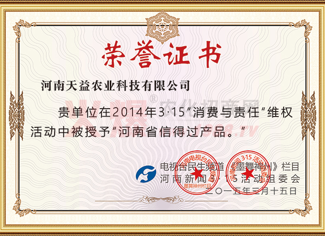 證書名稱:河南省信得過產(chǎn)品 發(fā)證機(jī)構(gòu):河南新聞3·15活動(dòng)組委會(huì)