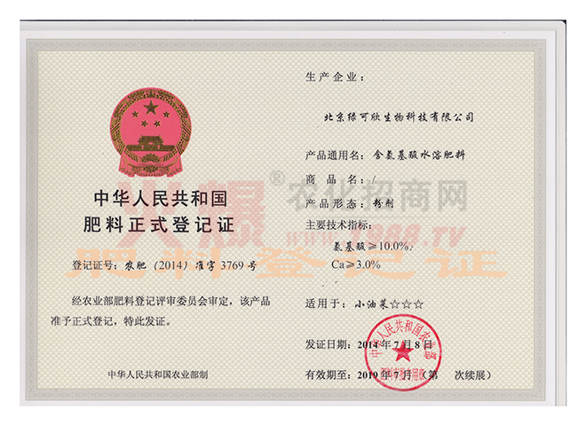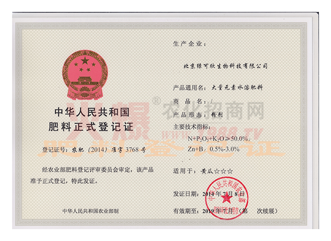 農(nóng)業(yè)部頒發(fā)的正式肥料登記證5個