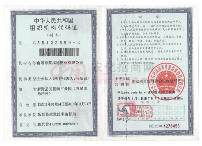 證書名稱:組織機(jī)構(gòu)代碼證 發(fā)證機(jī)構(gòu):新野縣質(zhì)量技術(shù)監(jiān)督局