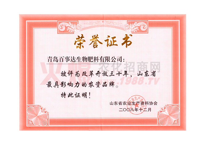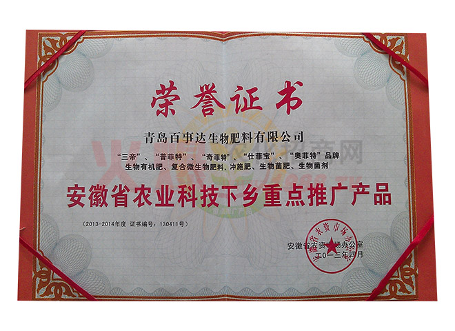 經(jīng)多年、多地的實(shí)踐證明,公司生產(chǎn)的“側(cè)孢短芽孢桿菌”系列生物肥料,適應(yīng)性廣、使用效果顯著。菌種活性高、穩(wěn)定性強(qiáng)、繁殖快,在改良土壤、增強(qiáng)作物抗病性、改善作物品質(zhì)、提高作物產(chǎn)量,增加經(jīng)濟(jì)效益等方面,都走在了行業(yè)的前面。公司產(chǎn)品相繼被評(píng)為山東省“改革開放30年放心農(nóng)資品牌”、安徽省“農(nóng)業(yè)科技下鄉(xiāng)重點(diǎn)推廣產(chǎn)品”、安徽省“生態(tài)種植高產(chǎn)創(chuàng)建主推產(chǎn)品”,中華全國(guó)供銷總社科技推廣中心“重點(diǎn)推廣農(nóng)資產(chǎn)品”、中華全國(guó)供銷總社科技推廣中心“合作推廣品牌”、中國(guó)質(zhì)量萬里行“國(guó)家監(jiān)督檢查產(chǎn)品質(zhì)量穩(wěn)定合格品牌”、中國(guó)國(guó)家綠色食品發(fā)展中心“綠色食品生產(chǎn)資料”。中央電視臺(tái)“上榜品牌”,被廣大用戶譽(yù)為生物肥效果。